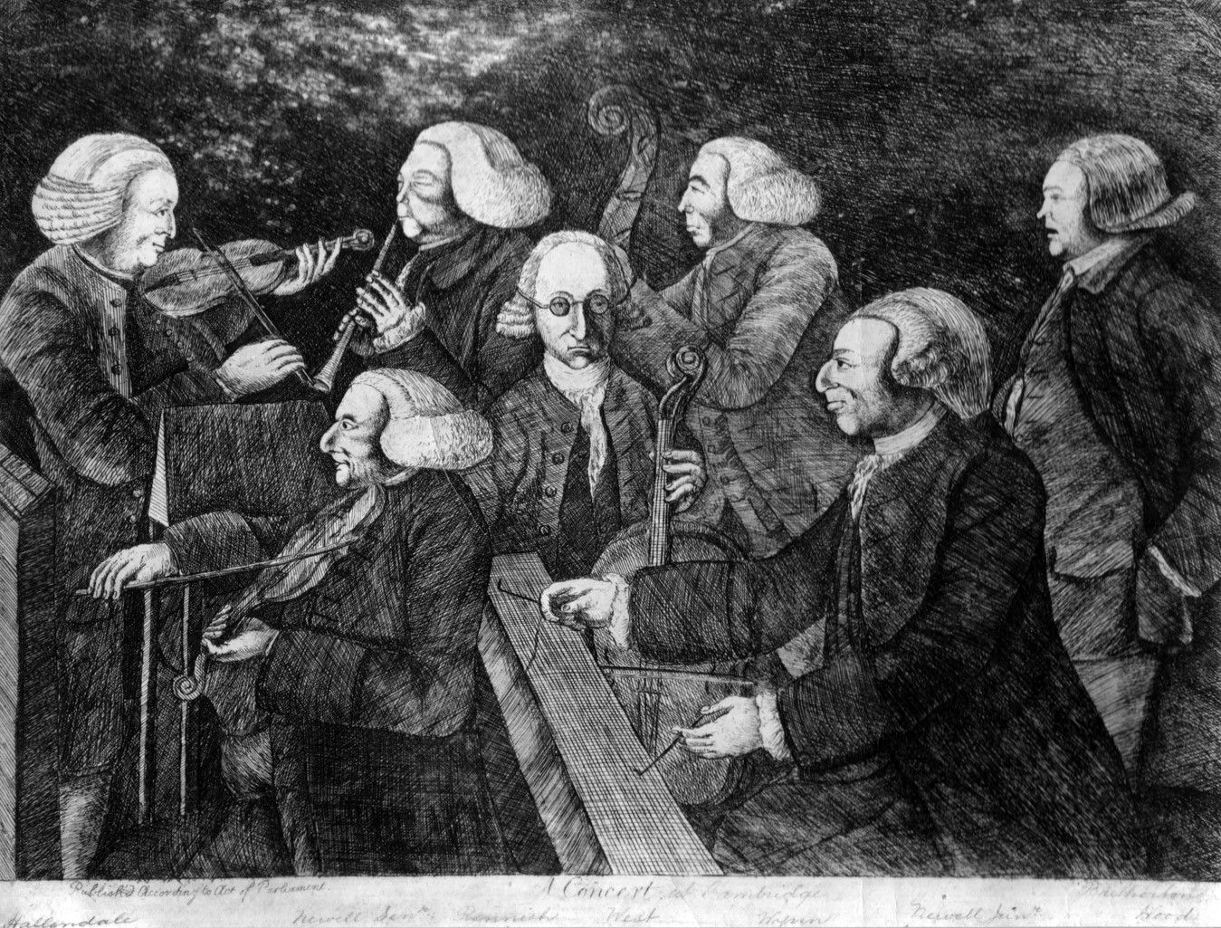 […] annotated in ink on the recto ‘1. Hellendaal / 2 Nowel Senr. / 4 White / 5 Wynn / 6Nowel Junr / 7 Wood / 1770 / at Cambridge designed by W Orde etched by Mr Hume the player on the Pantelione’.