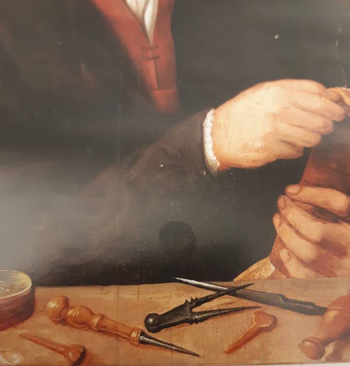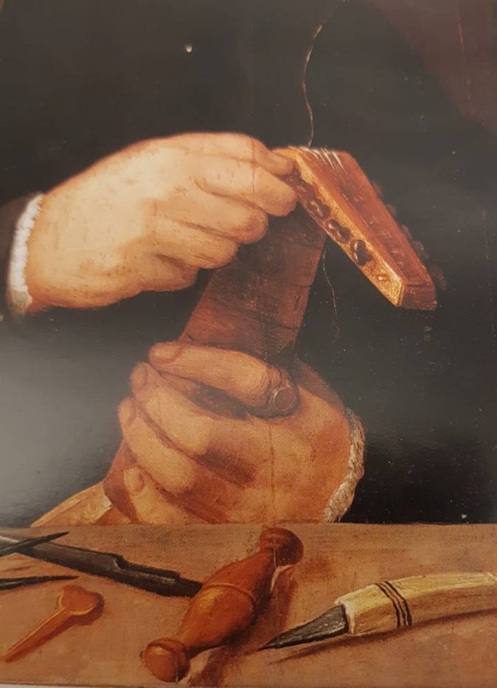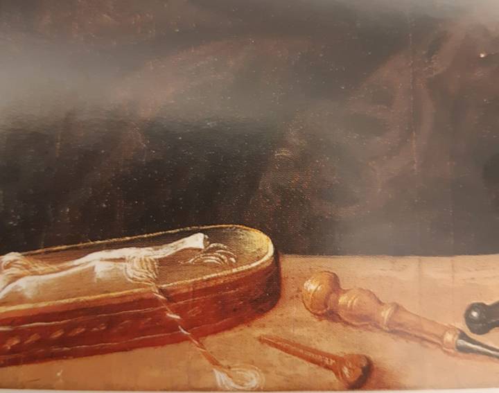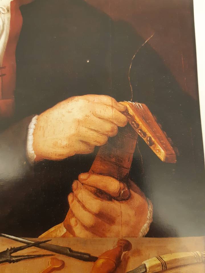 Great care was dedicated to the depiction of the tools in the foreground. Particularly intetesting is the string-box.