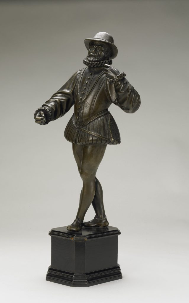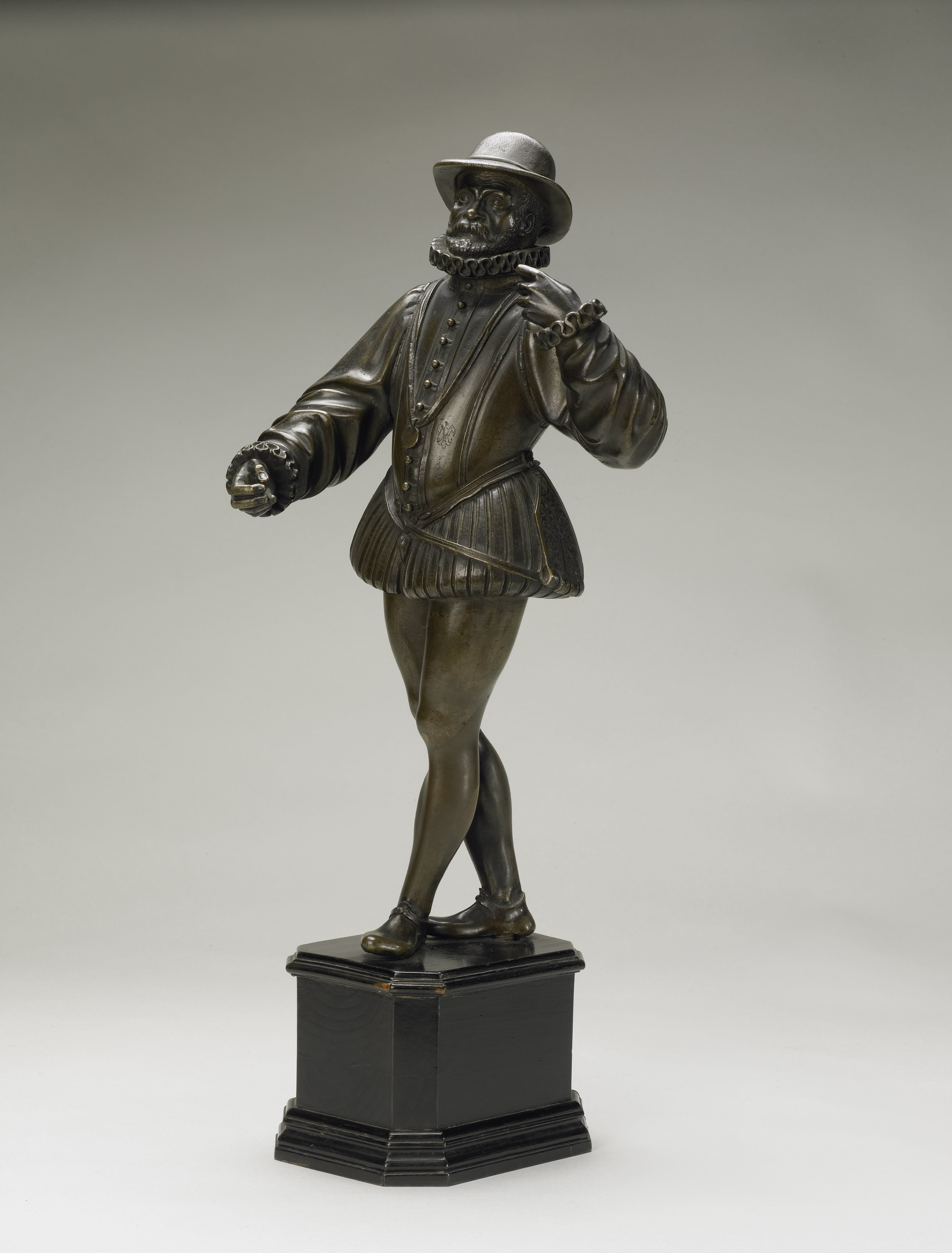 […] The statuette represents a man with beard and drooping moustache and is dressed in the full bag-like breeches known as trunk hose, with stockings, and a doublet with a lace ruff and cuffs, and he has a small round brimmed hat on his head. His clothing accurately reflects the fashion at the Spanish Court in about 1575. For a long time it was supposed that the statue could be a portrait of William of Orange, but there are unsatisfactory grounds for this identification—the face differs too greatly from the known portraits of the prince. […]