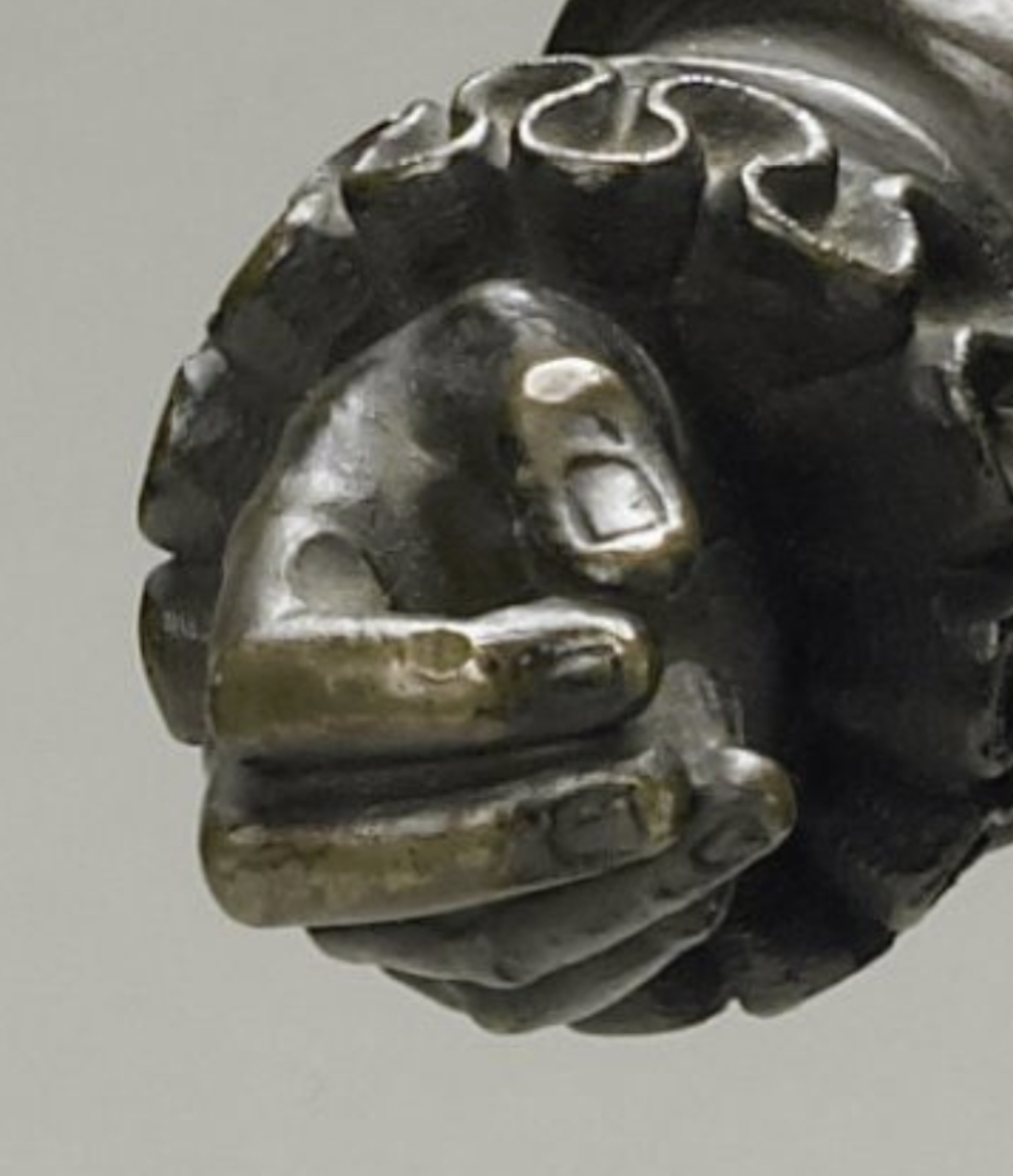 The grip of the bow described in this sculpture is magnificent. The right hand had to hold a large bow underhand – see the slope on the second finger. The fourth finger is bended towards the palm to hold the hair and help directing the strokes.